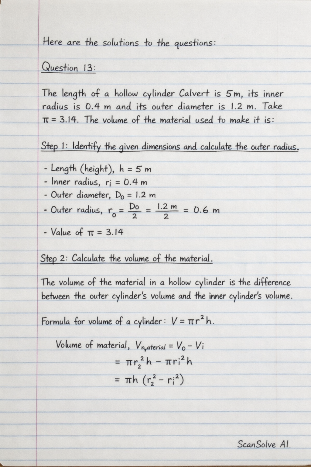 Question 13: The length of a hollow cylinder Calvert is , its inner radius is and its outer diameter is . Take . The volume of the material used to make it is: