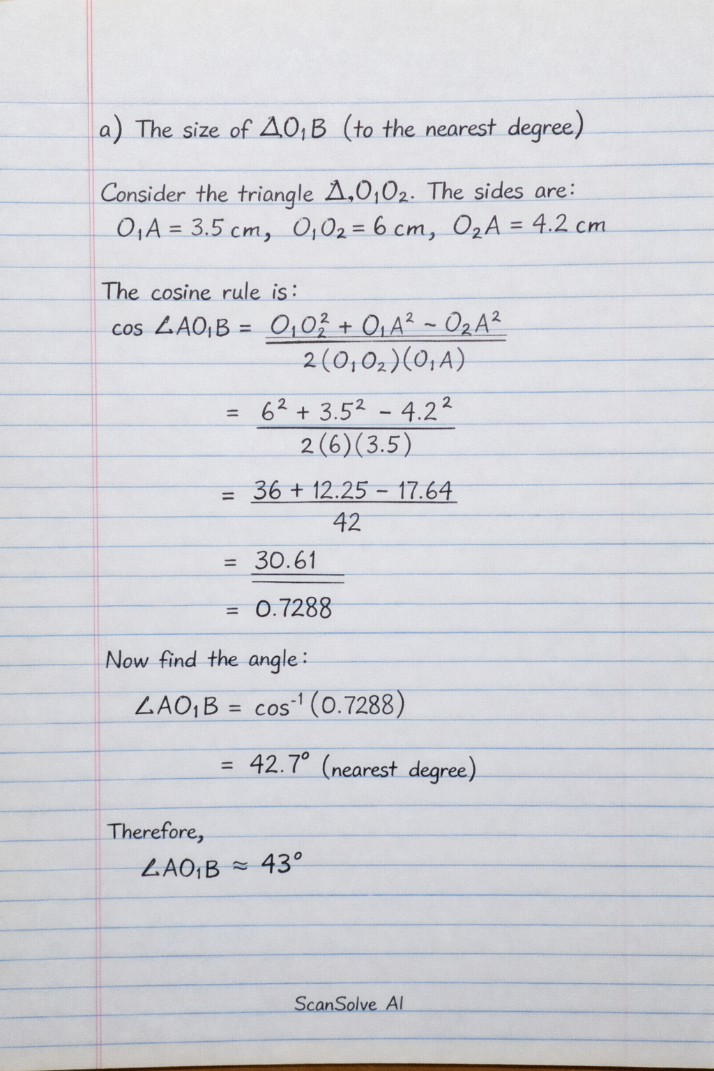 Two circles of radii 3.5 and 4.2 cm with centres O1 and O2 intersect at points A and B as shown. The distance between the two centres is 6 cm. Calculate: (a) The size of angle AO1B. (b) The size of angle AO2B. (c) The area of quadrilateral O1AO2B. (d) The shaded area.