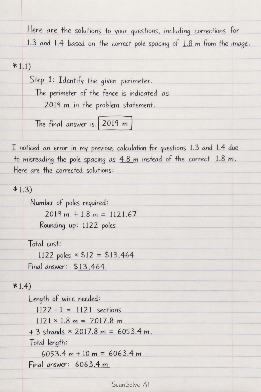 Here are the solutions to your questions, including corrections for 1.3 and 1.4 based on the correct pole spacing of 1.8 m from the image.