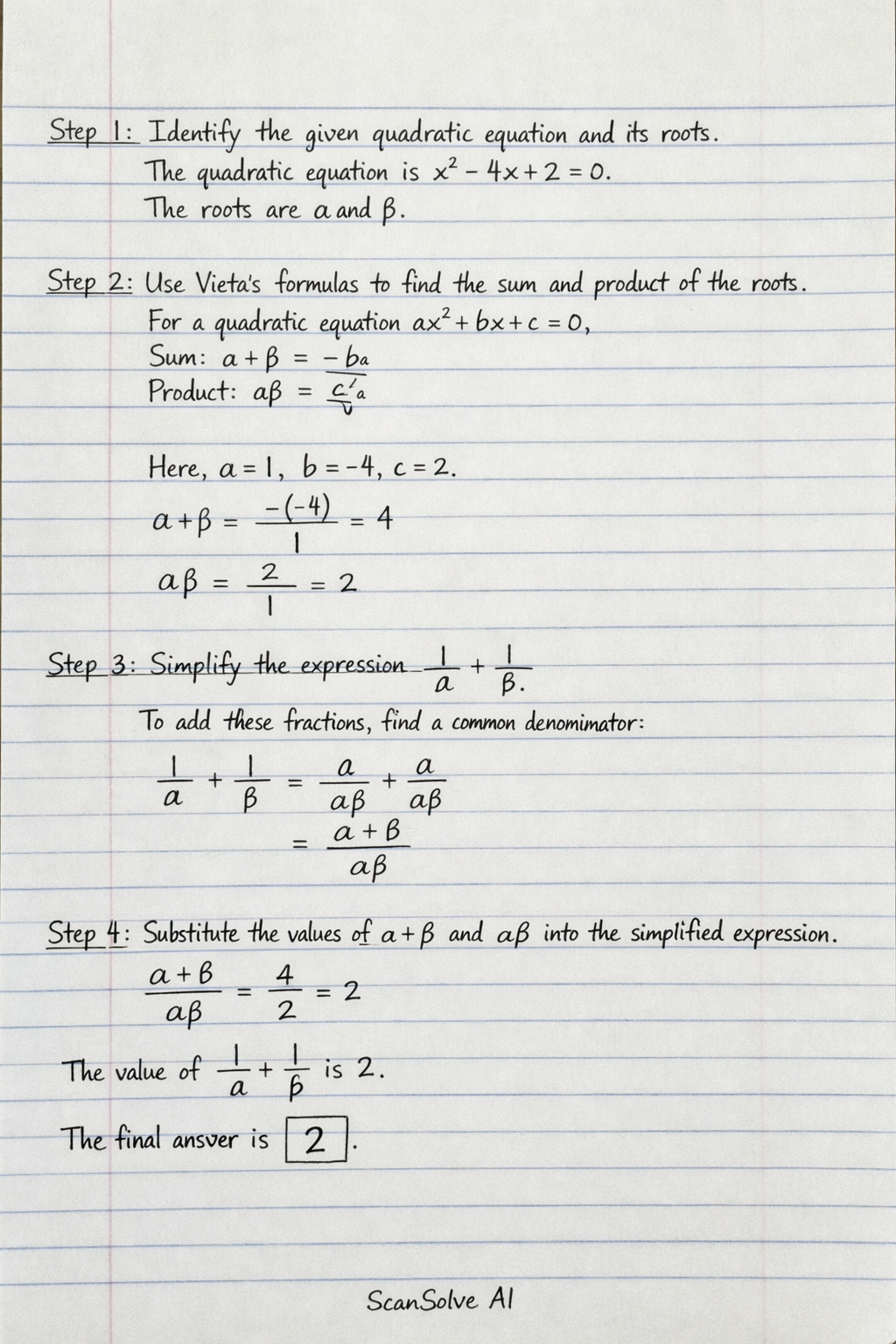 Step 2: Use Vieta's formulas to find the sum and product of the roots.