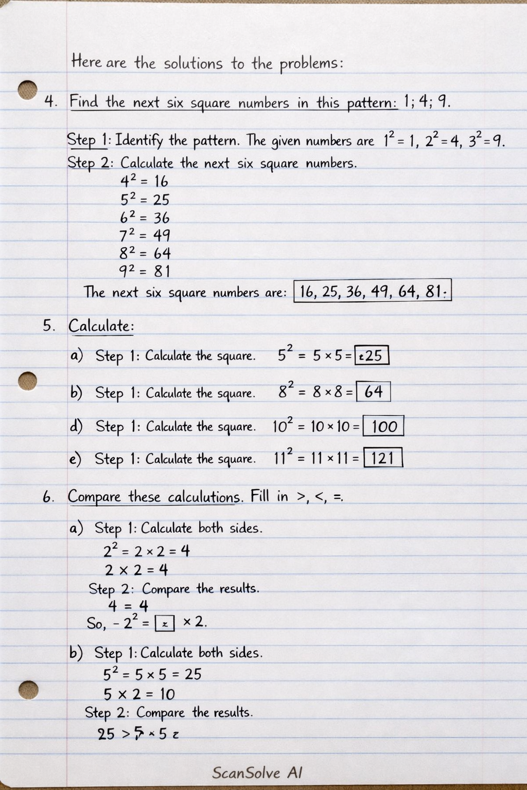 4. Find the next six square numbers in this pattern: 1; 4; 9.