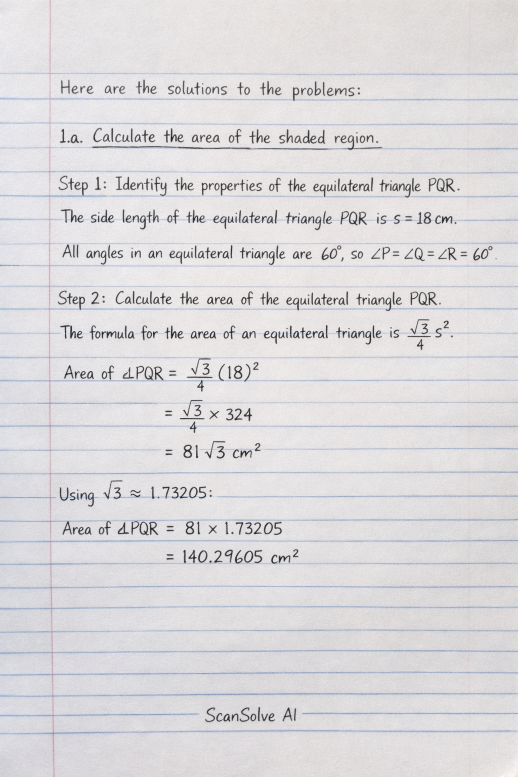 $$ \text{Area of } \triangle PQR \approx 81 \times 1.73205 = 140.29605 \text{ cm}^2 $$
