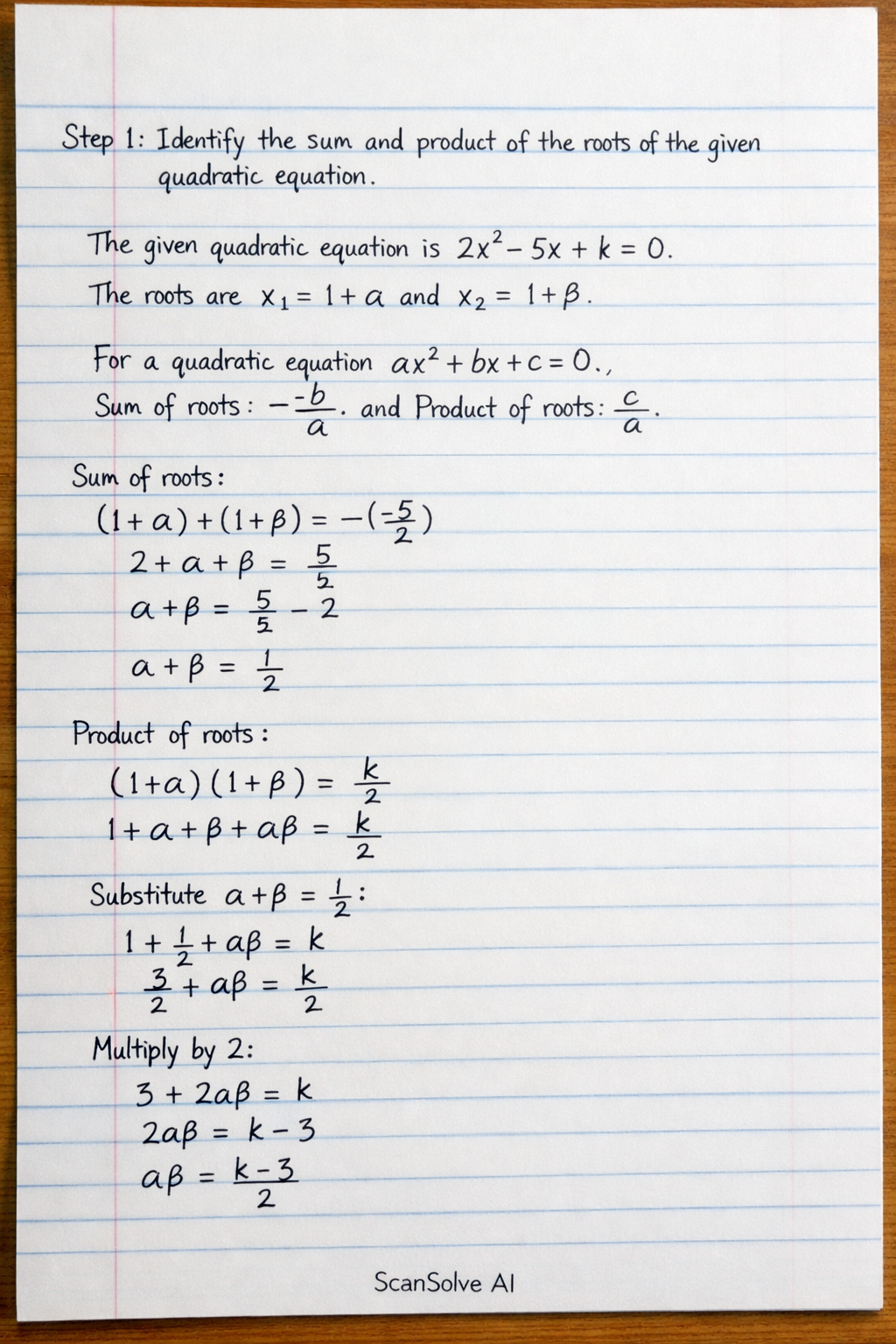 Step 1: Identify the sum and product of the roots of the given quadratic equation.