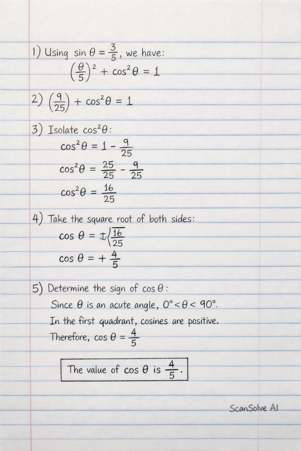 $$ \left(\frac{3}{5}\right)^2 + \cos^2 \theta = 1 $$