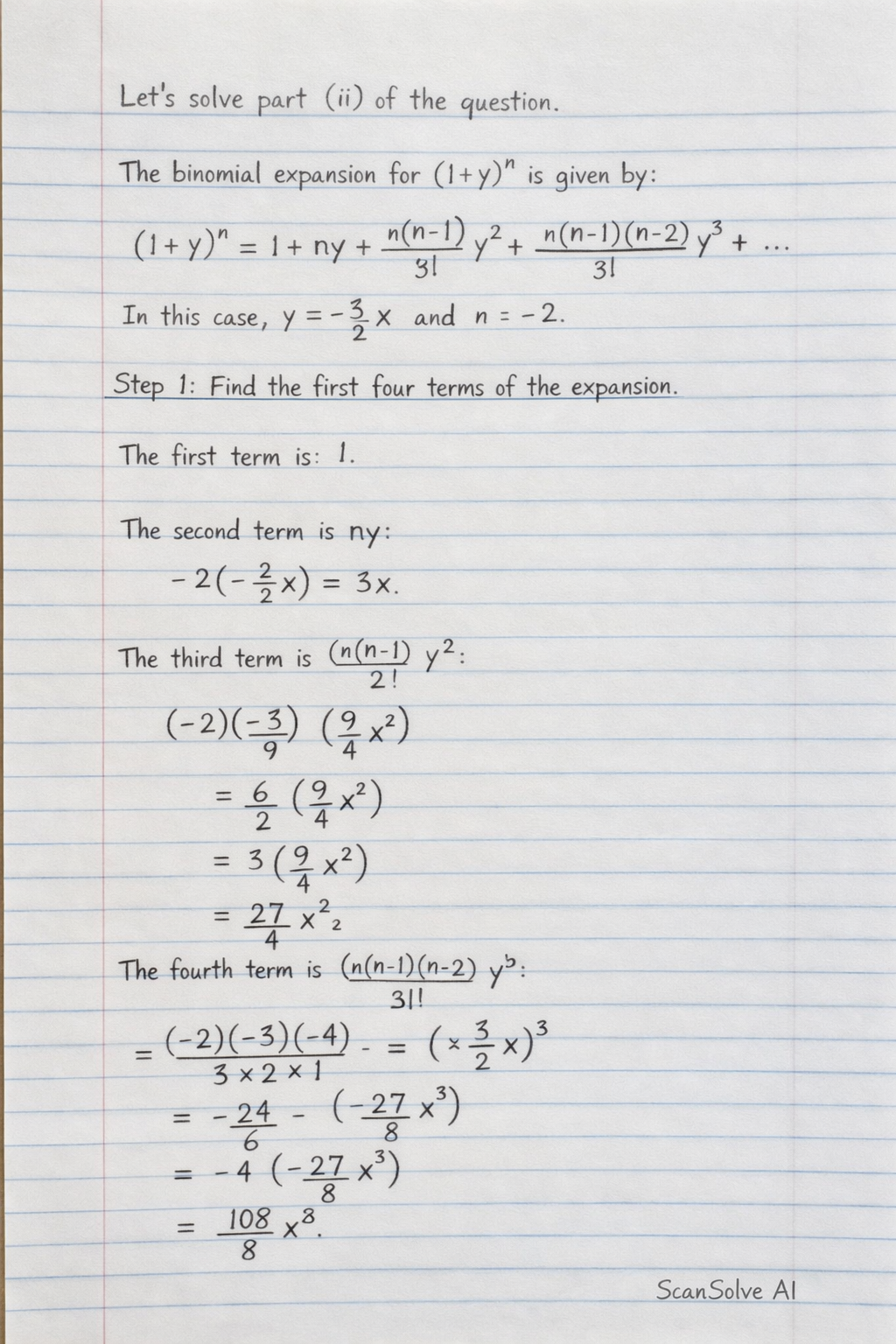 ii) Obtain the first four terms of the binomial expansion of (1 - (3)/(2)x)^-2 and find the set of values of x for which the expansion is valid.