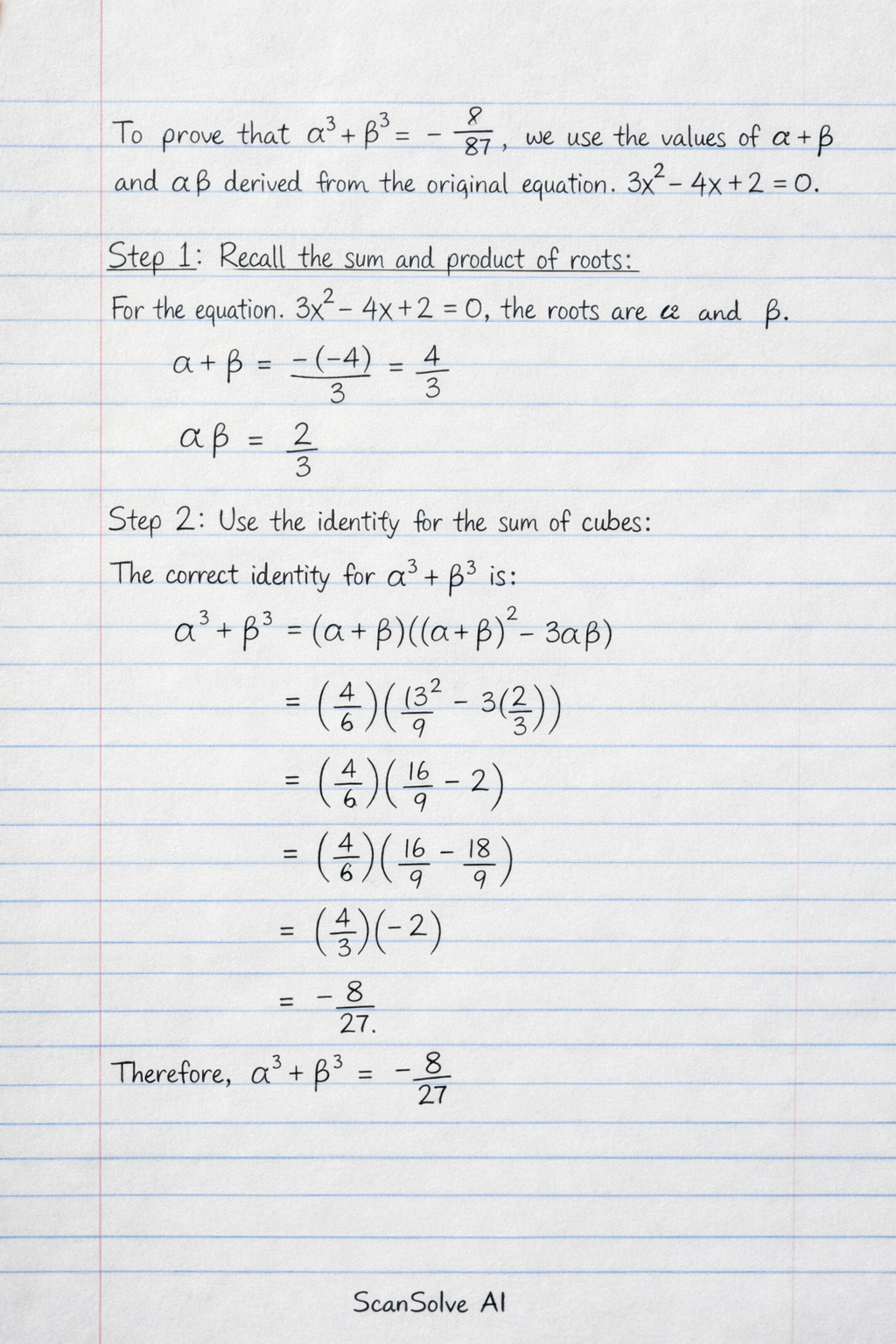 To prove that α3+β3=−278, we use the values of α+β and αβ derived from the original quadratic equation 3x2−4x+2=0.