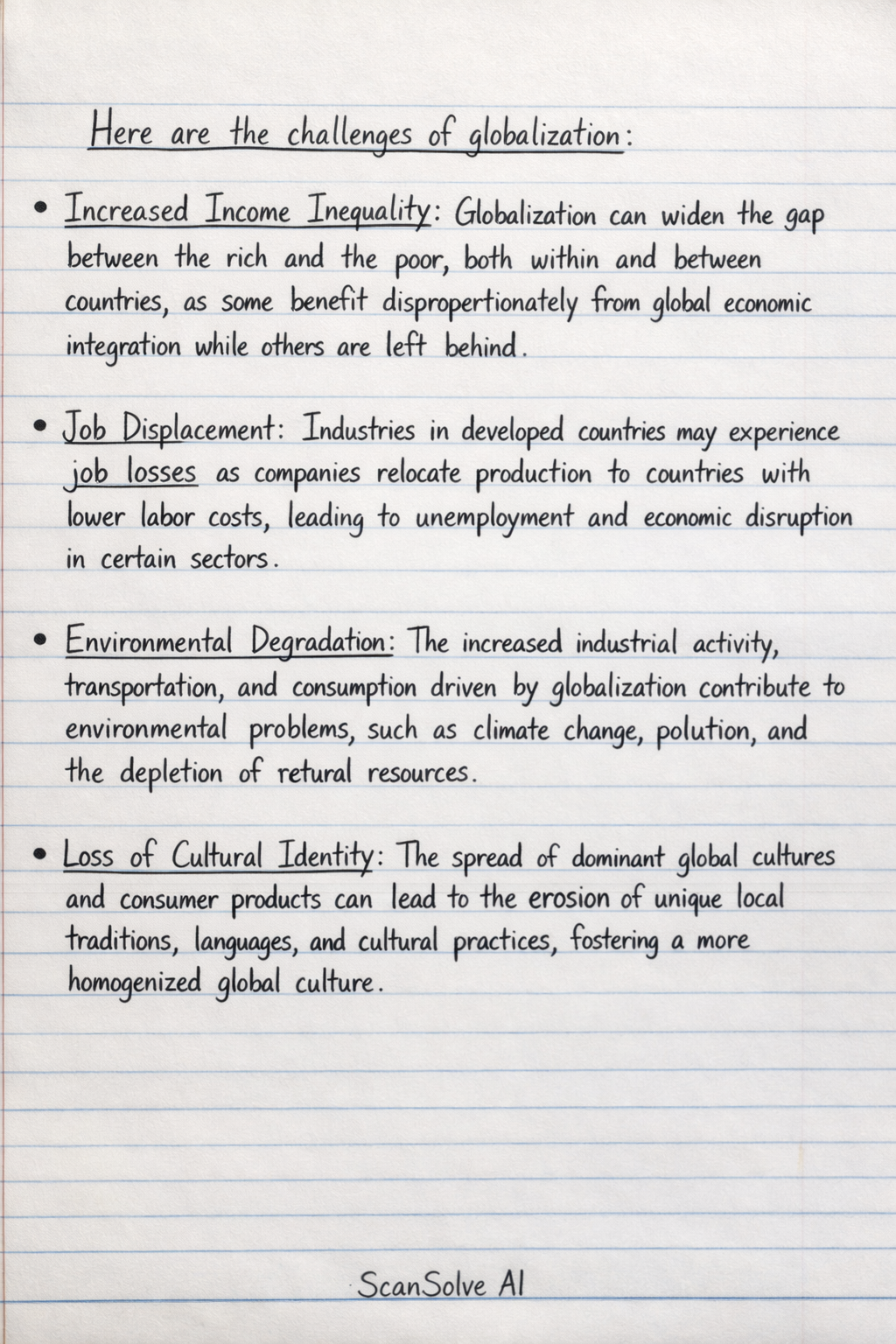 Environmental Degradation: The increased industrial activity, transportation, and consumption driven by globalization contribute to environmental problems* such as climate change, pollution, and the depletion of natural resources.