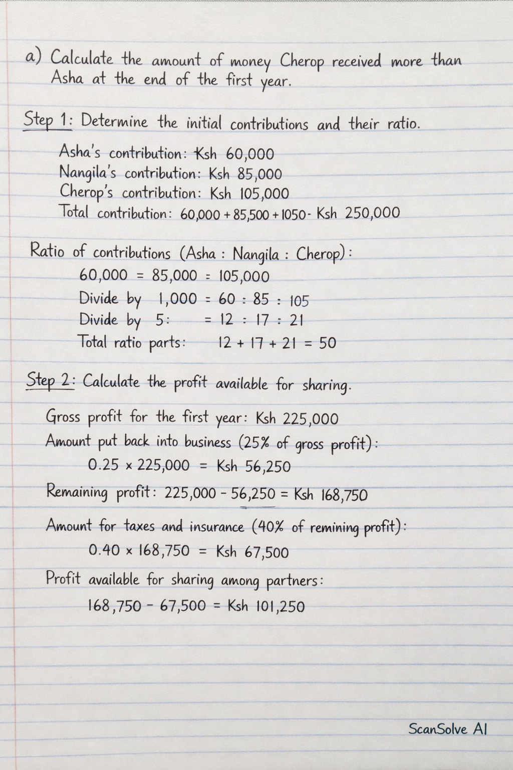 b) Nangila further invested Ksh 25,000 into the business at the beginning of the second year. Given that the gross profit at the end of the second year increased in the ratio 10:9, calculate Nangila's shares of the profit at the end of the second year.