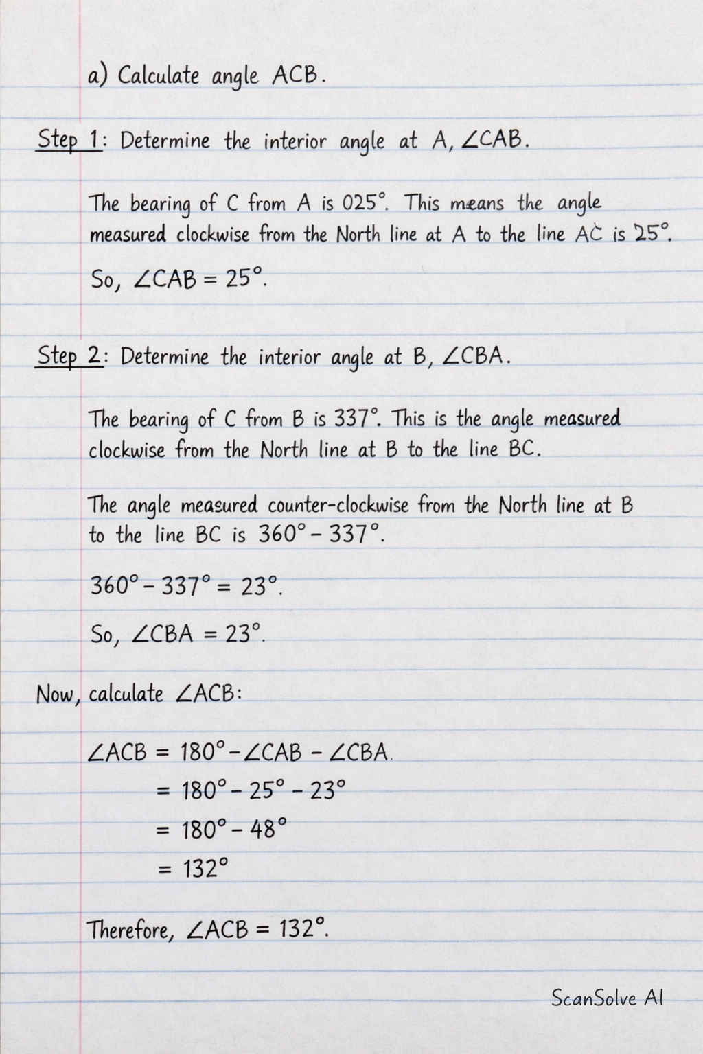 The bearing of C from A is 025∘. This means the angle measured clockwise from the North line at A to the line AC is 25∘.