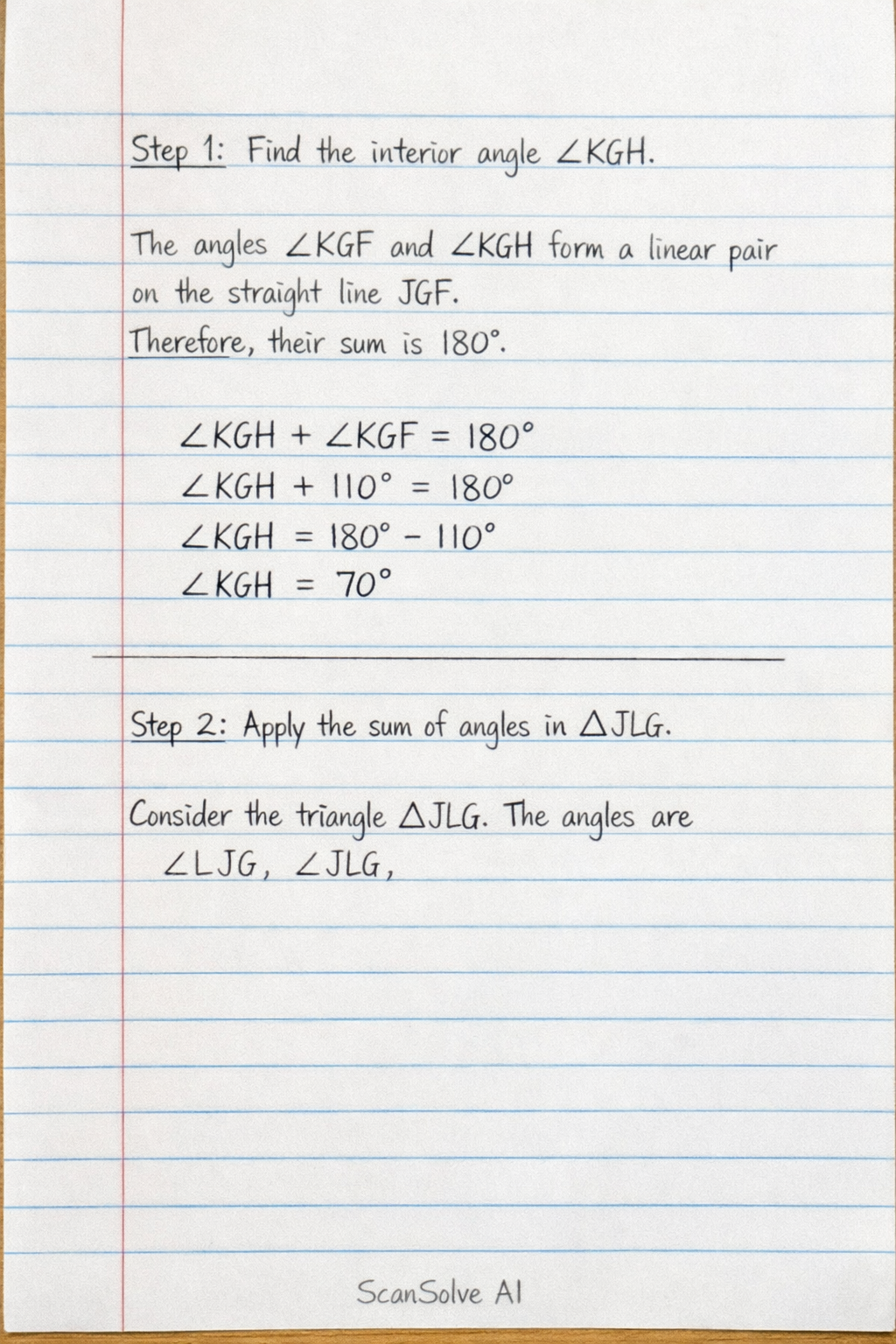 Step 2: Apply the sum of angles in △JLG.
