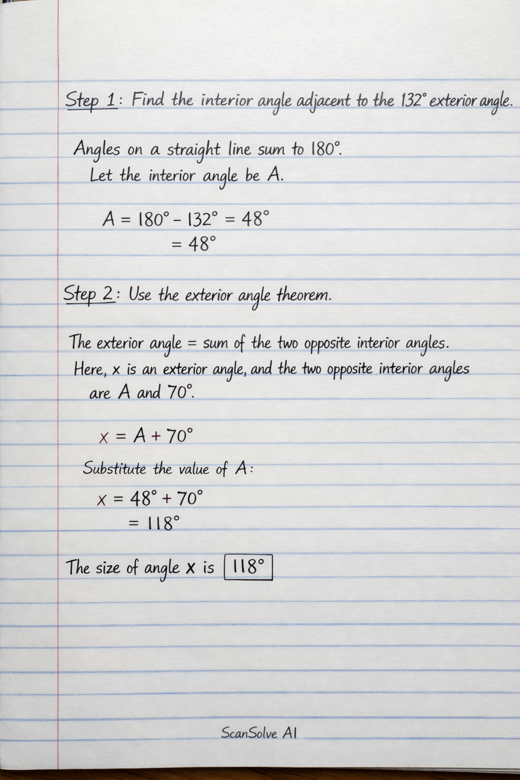 Step 1: Find the interior angle of the triangle adjacent to the 132∘ exterior angle.