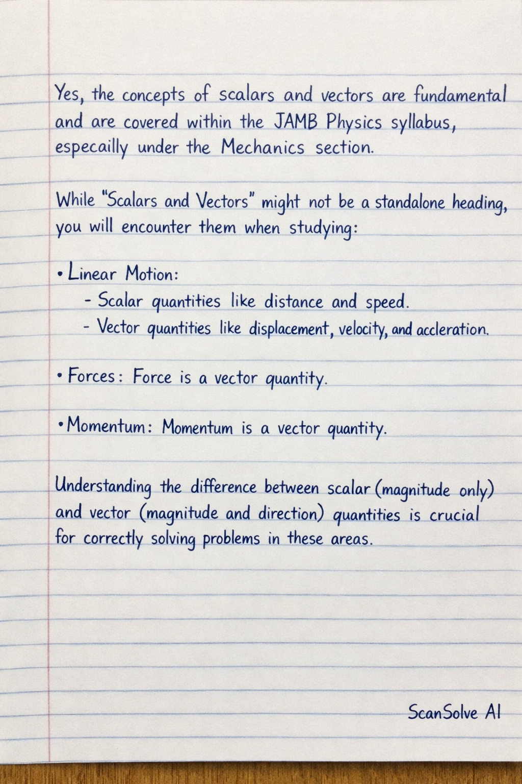 Yes, the concepts of scalars and vectors are fundamental and are covered within the JAMB Physics syllabus, especially under the Mechanics section.