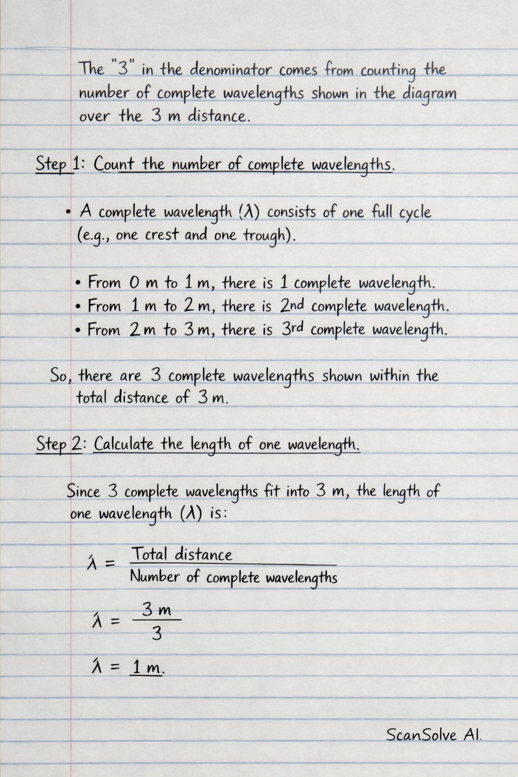 Since 3 complete wavelengths fit into 3m, the length of one wavelength (λ) is:
