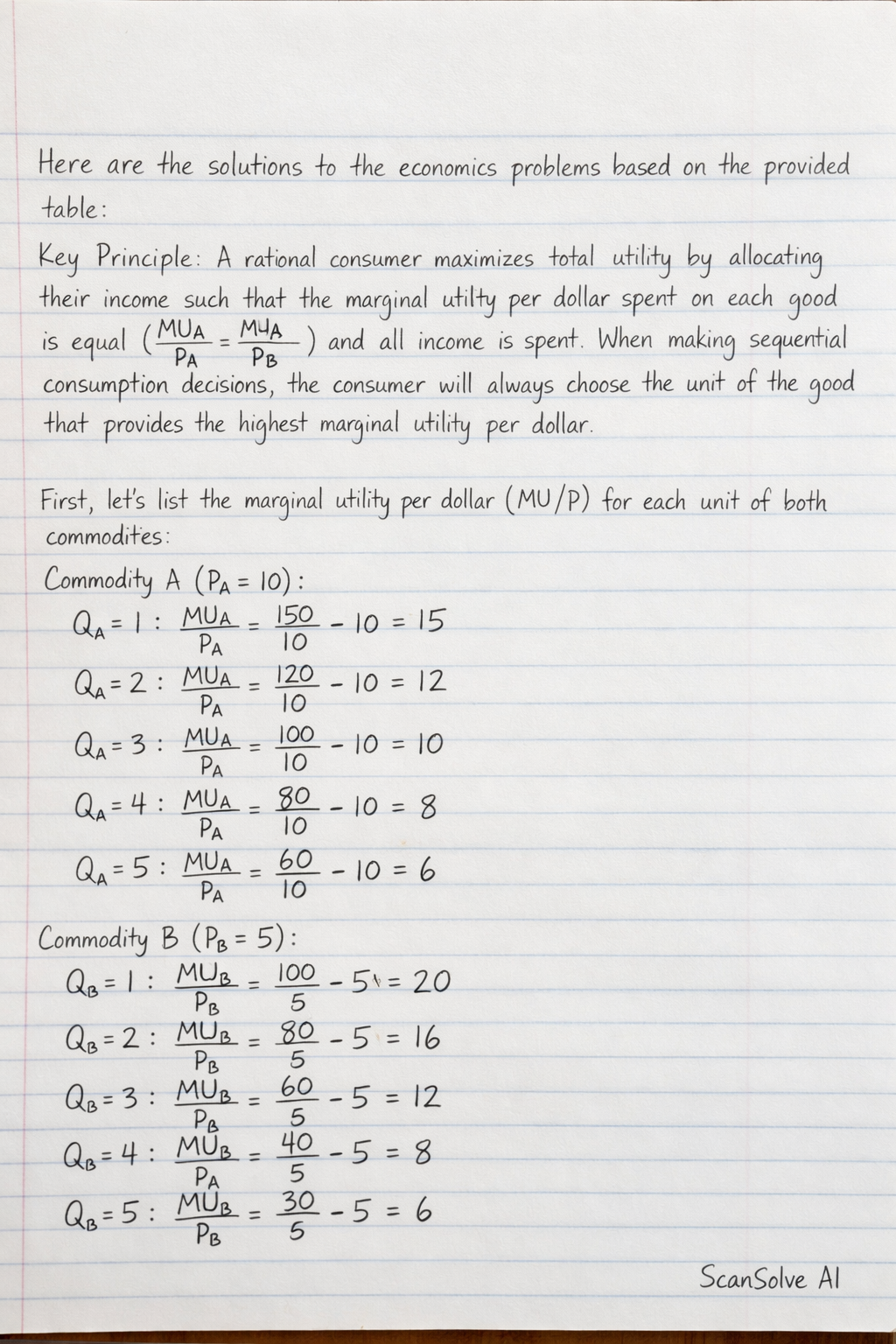 Key Principle: A rational consumer maximizes total utility by allocating their income such that the marginal utility per dollar spent on each good is equal ((MUA)/(PA) = (MUB)/(PB)