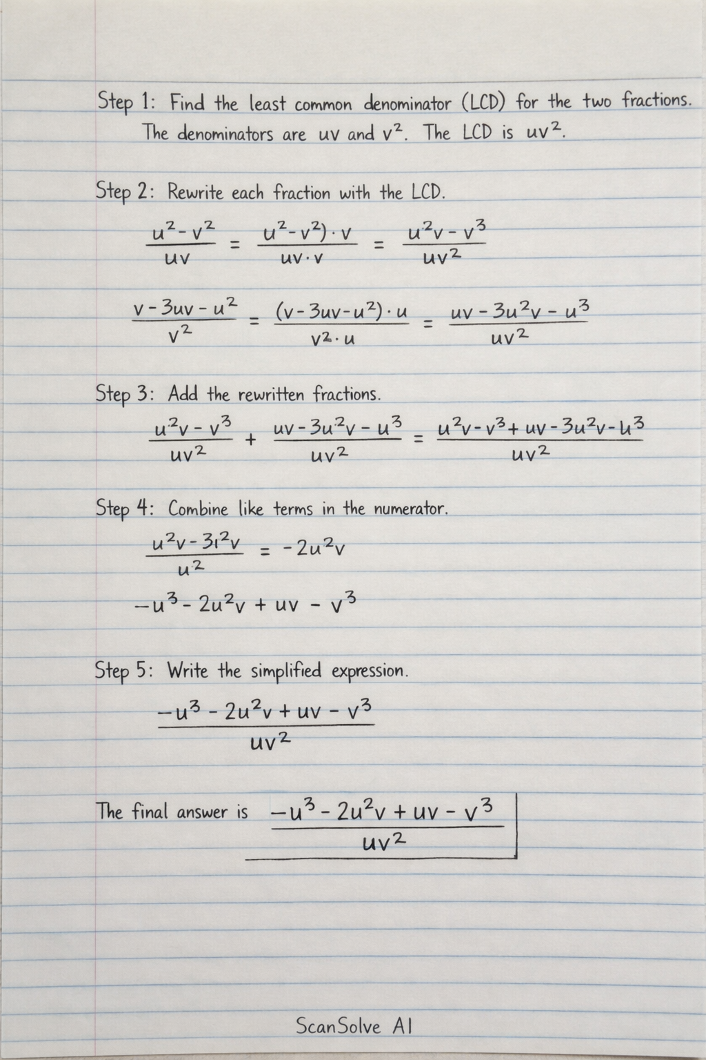 The denominators are uv and v2. The LCD of uv and v2 is uv2.