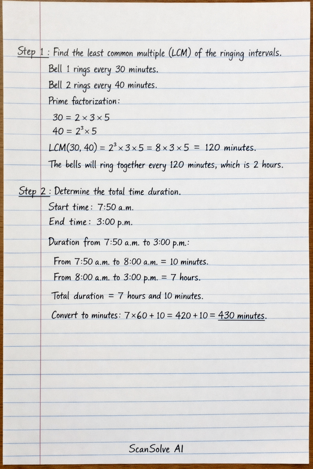 2. Lessons in Lake Primary and Kisumu Girls High Schools take 30 minutes and 40 minutes respectively. The two bells ring simultaneously at 7.50 a.m. How many times will they ring together again between 7.50 a.m. and 3 p.m.?