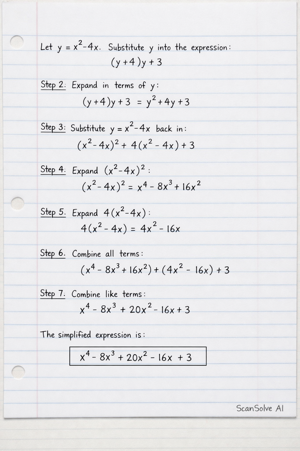 Step 1: Let y=x2−4x. Substitute y into the expression.