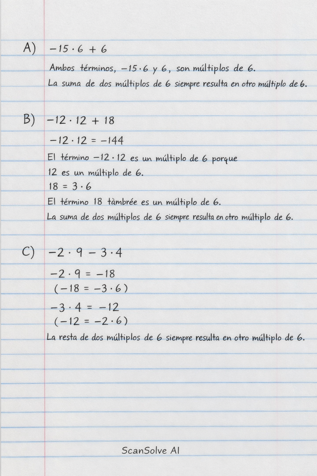 El término −2⋅9 es igual a −18, que es un múltiplo de 6 (−18=−3⋅6). El término −3⋅4 es igual a −12, que también es un múltiplo de 6 (−12=−2⋅6). La resta de dos múltiplos de 6 siempre resulta en otro múltiplo de 6.
