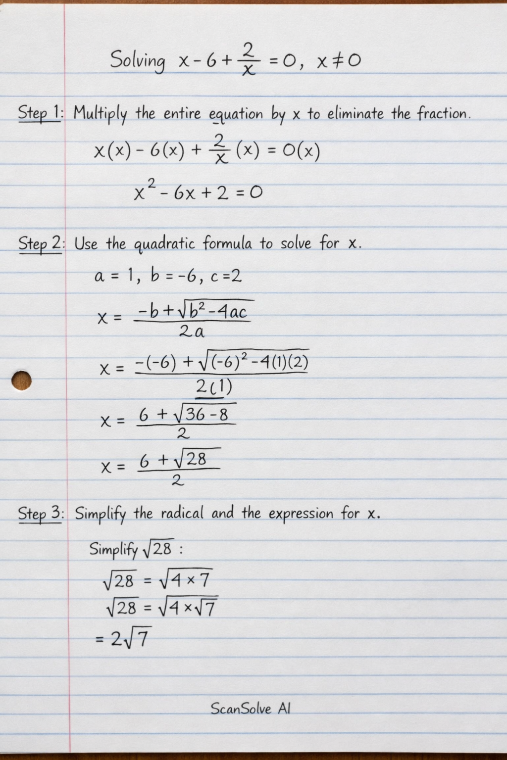 $$ x = \frac{6 \pm \sqrt{28}}{2} $$