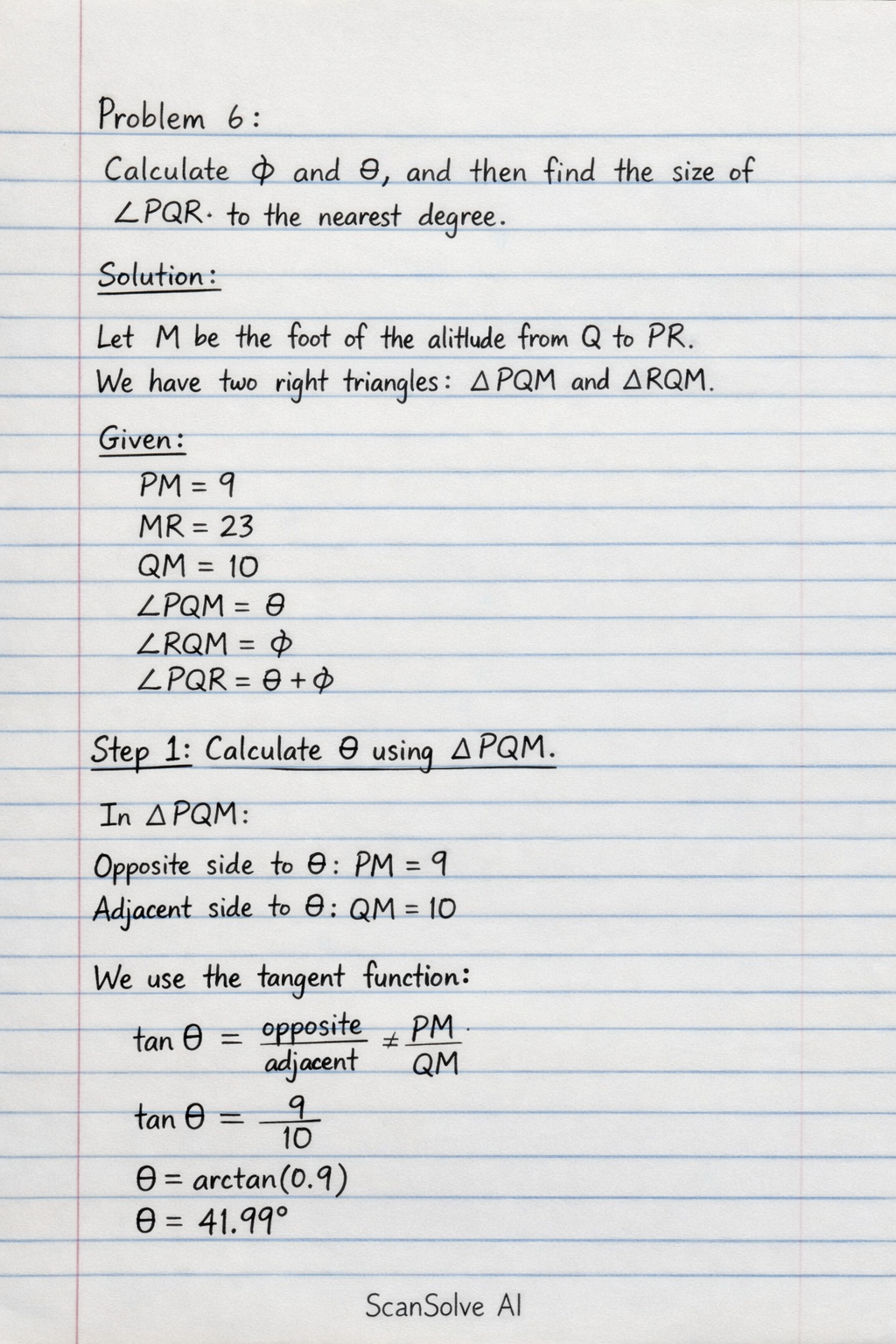 Step 1: Calculate θ using △PQM.