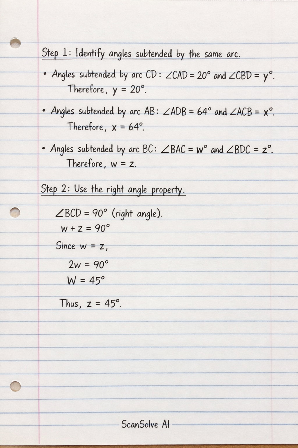 • Angles subtended by arc BC: ∠BAC=w∘ and ∠BDC=z∘.