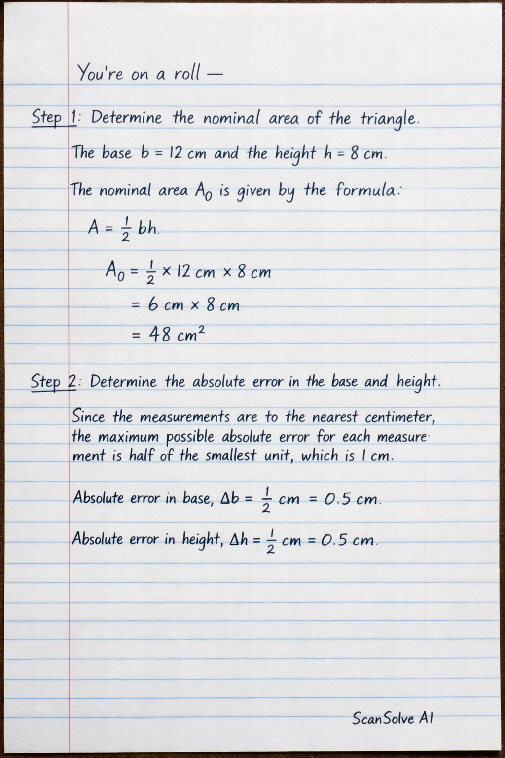 Step 2: Determine the absolute error in the base and height. Since the measurements are to the nearest centimeter, the maximum possible absolute error for each measurement is half of the smallest unit, which is cm. Absolute error in base, . Absolute error in height, .