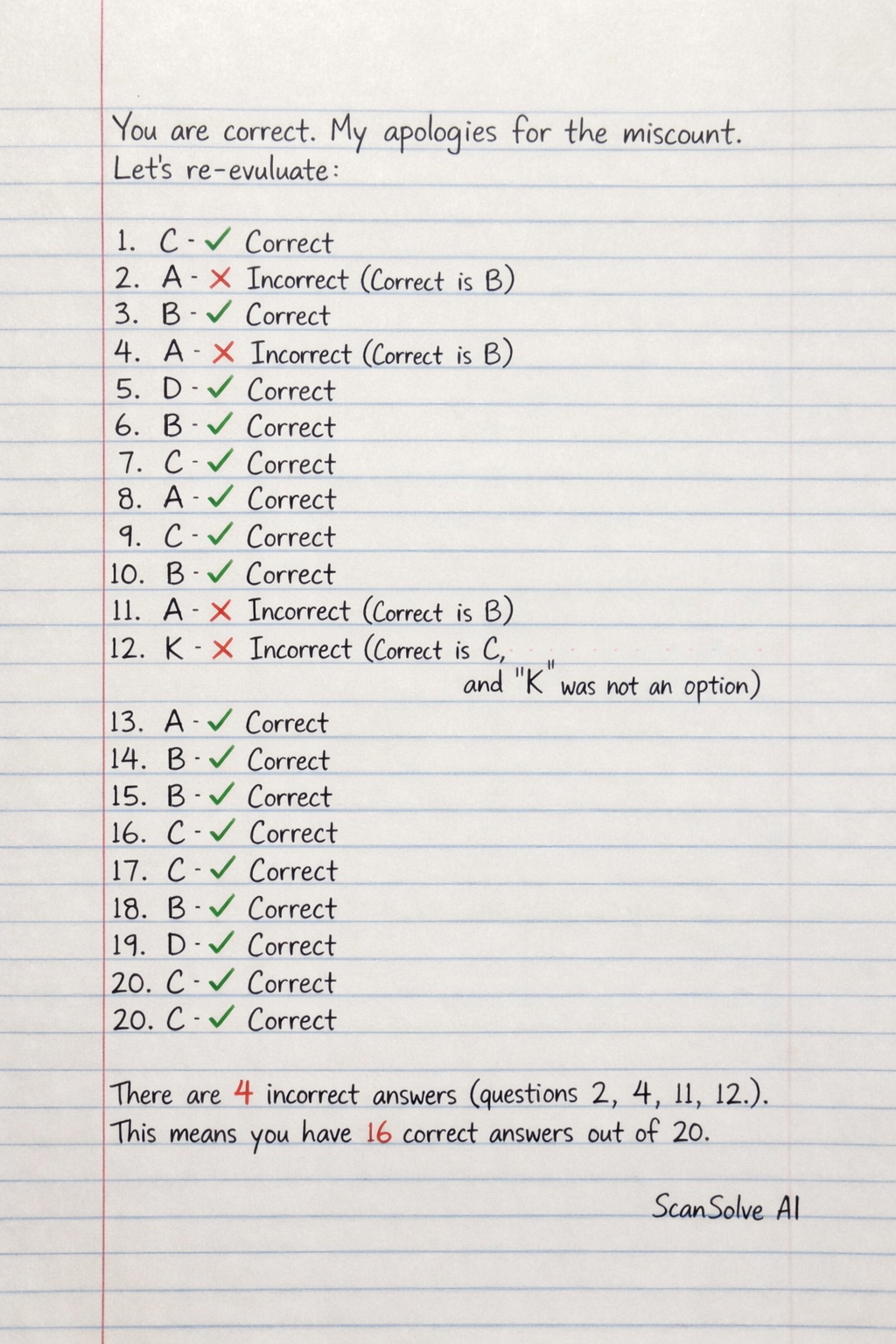 There are 4 incorrect answers (questions 2, 4, 11, 12).