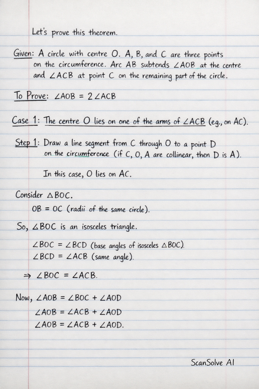 Theorem Statement: The angle subtended by an arc at the centre of a circle is double the angle subtended by it at any point on the remaining part of the circle.