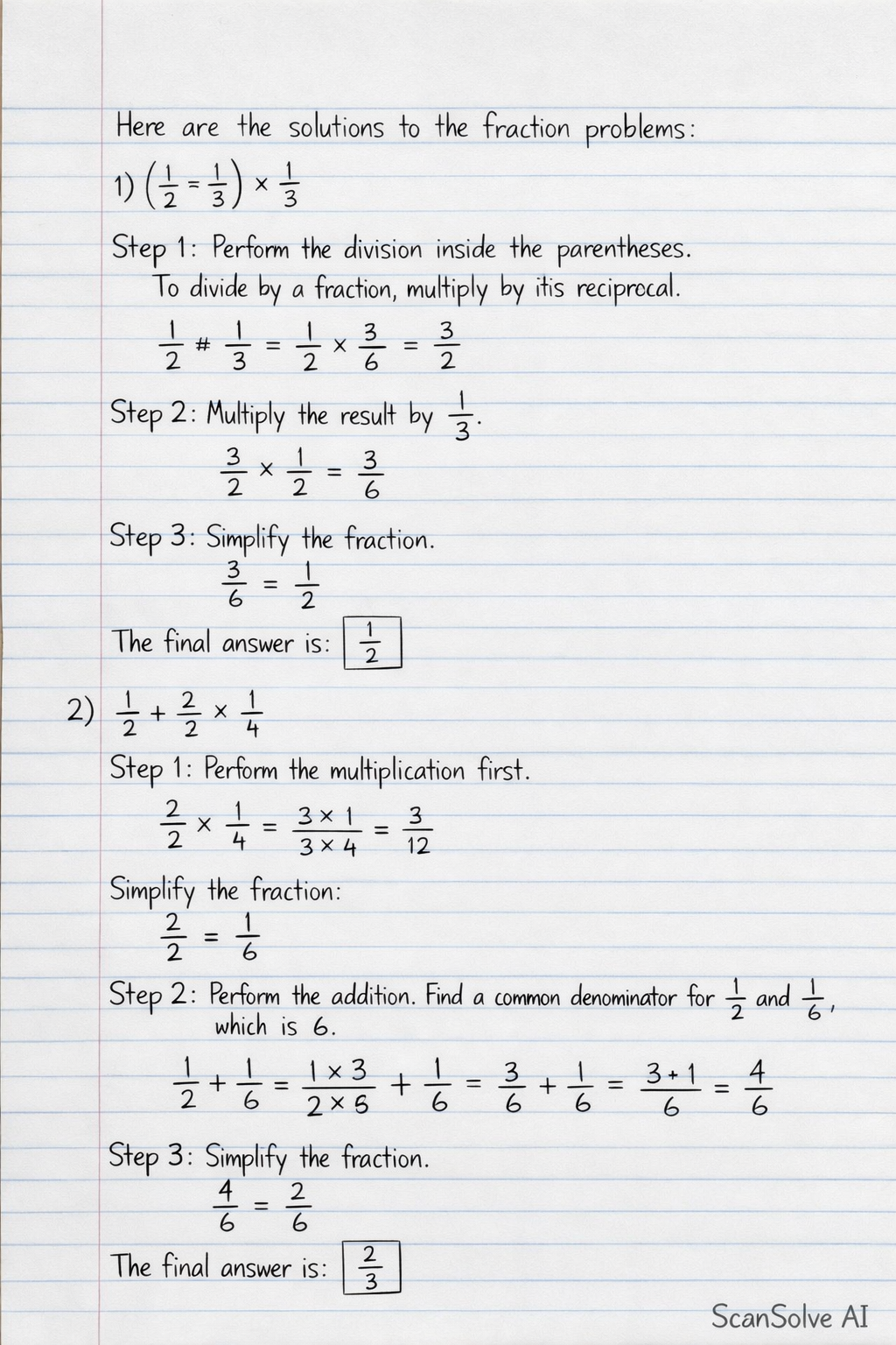 Here are the solutions to the fraction problems: