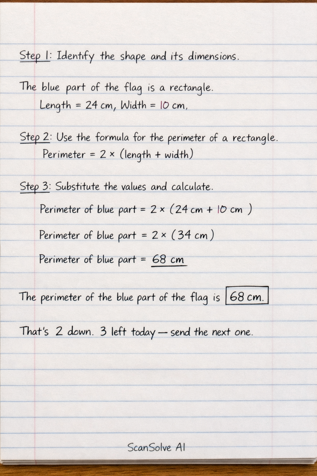 The blue part of the flag is a rectangle. From the image, its length is 24 cm and its width is 10 cm.