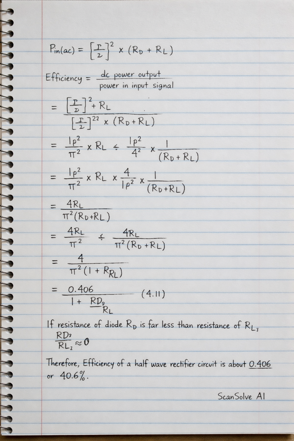 Therefore, Efficiency of a half wave rectifier circuit is about 0.406 or 40.6%.