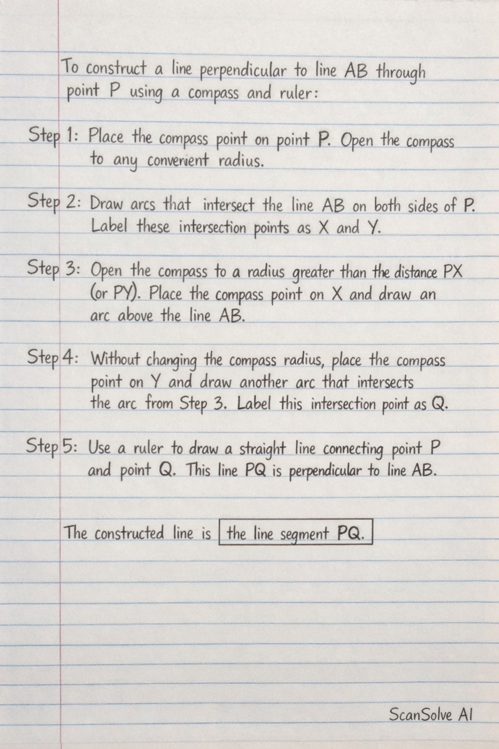 To construct a line perpendicular to line AB through point P using a compass and ruler: