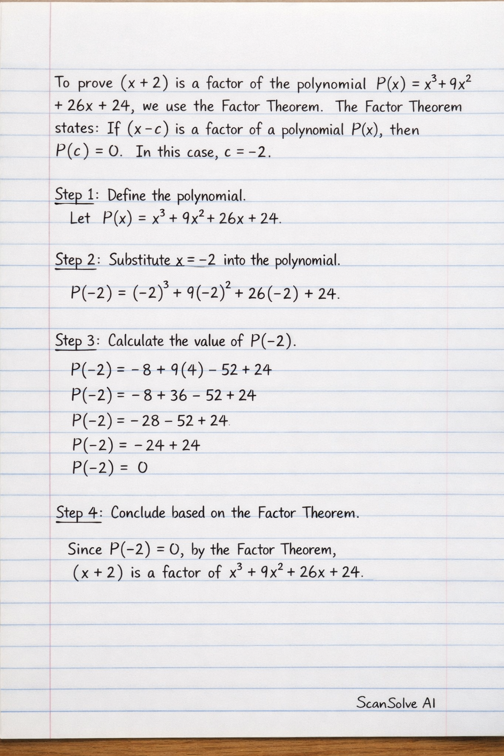 To prove that (x+2) is a factor of the polynomial P(x)=x3+9x2+26x+24, we use the Factor Theorem. The Factor Theorem states that if (x−c) is a factor of a polynomial P(x), then P(c)=0. In this case, c=−2.