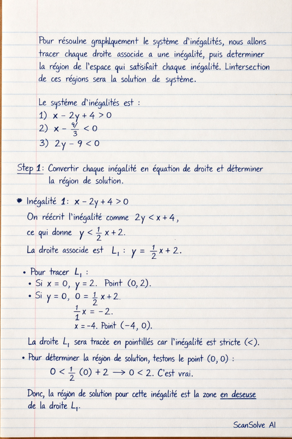 Inégalité 1: On réécrit l'inégalité comme , ce qui donne . La droite associée est . Pour tracer : • Si , . Point . • Si , . Point . La droite sera tracée en pointillés car l'inégalité est stricte (). Pour déterminer la région de solution, testons le point : . C'est vrai. Donc, la région de solution pour cette inégalité est la zone en dessous de la droite .