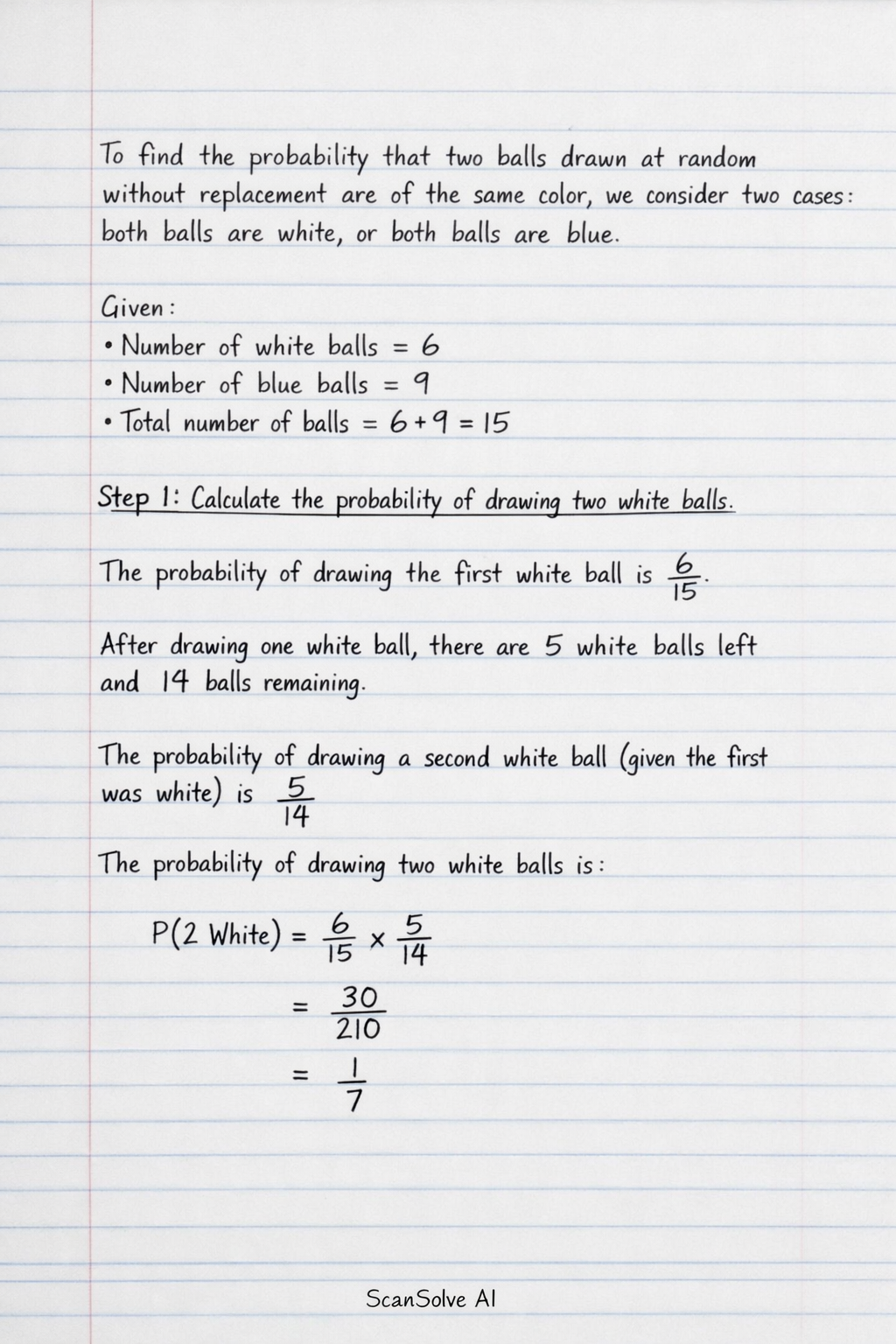 Step 1: Calculate the probability of drawing two white balls.
