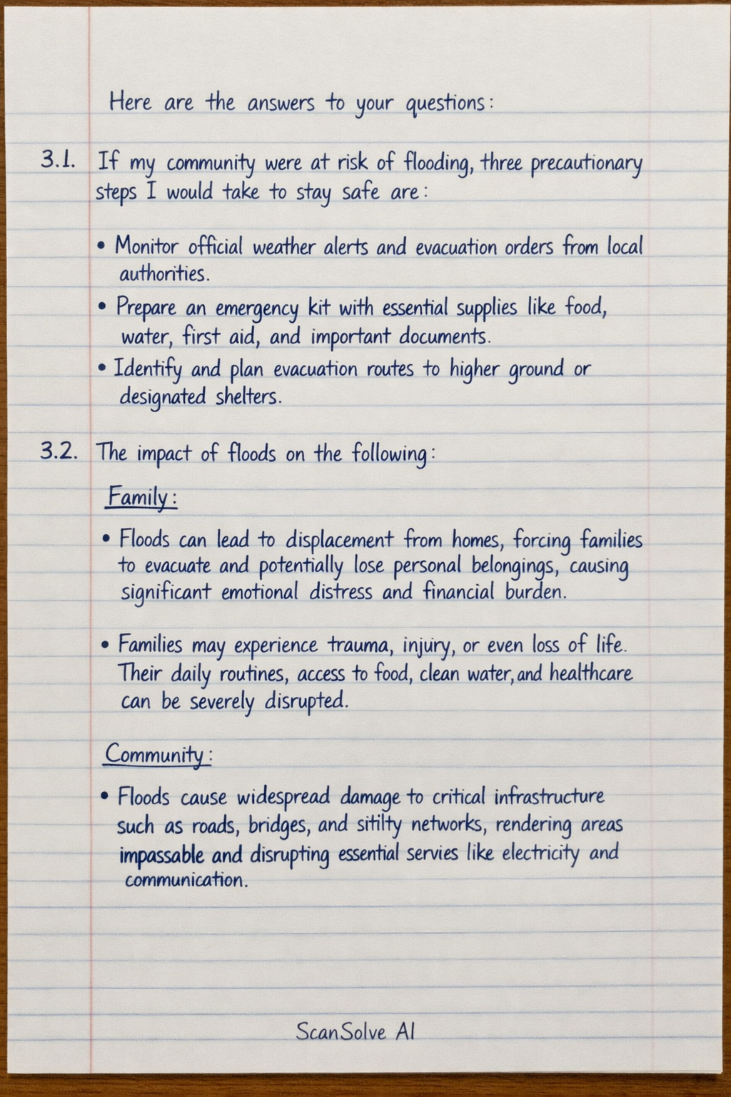 3.1. If my community were at risk of flooding, three precautionary steps I would take to stay safe are: