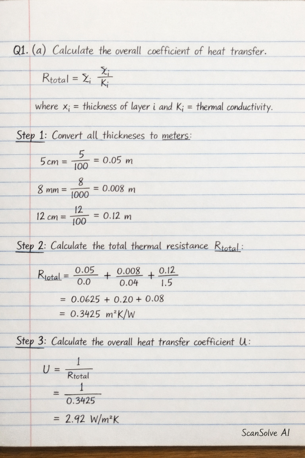 The overall heat transfer coefficient is calculated using the sum of individual thermal resistances for each layer. The formula for total thermal resistance is: where is the thickness of layer and is its thermal conductivity.