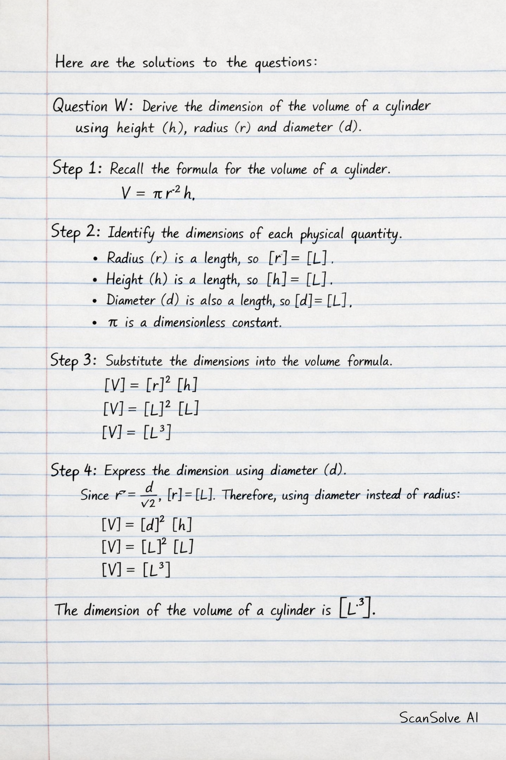 Question W: Derive the dimension of the volume of a cylinder using height (h), radius (r), and diameter (d).