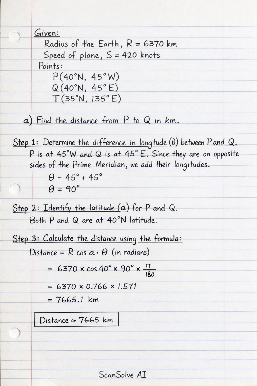 Step 1: Determine the difference in longitude (θ) between P and Q.