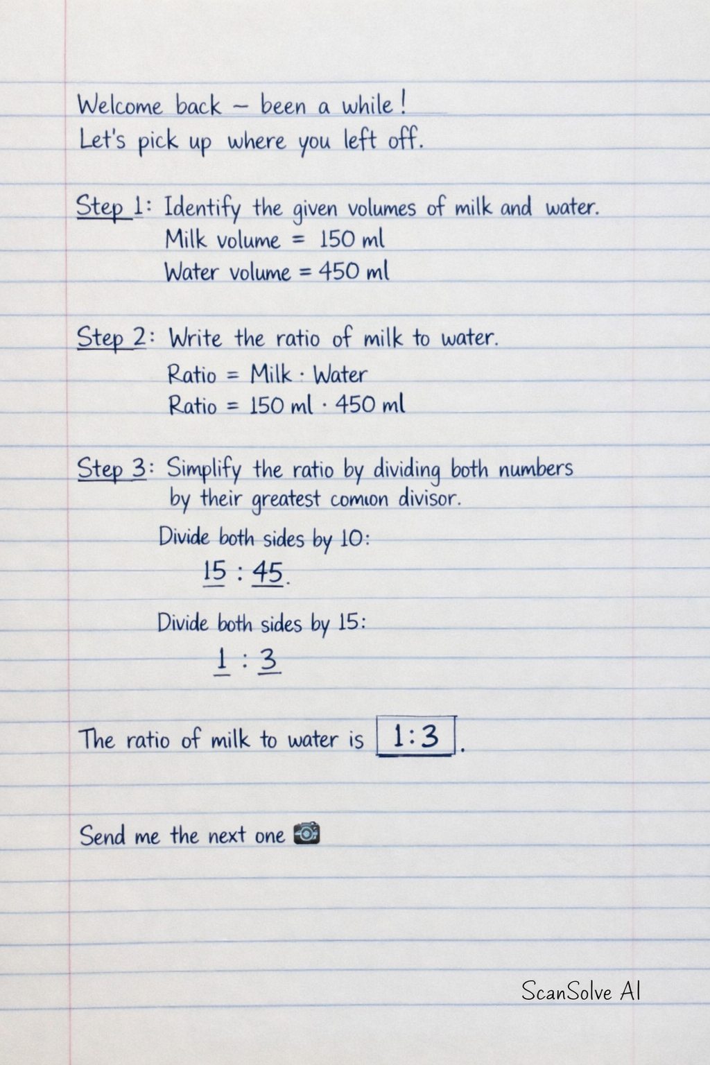 Welcome back — been a while! Let's pick up where you left off. Step 1: Identify the given volumes of milk and water.