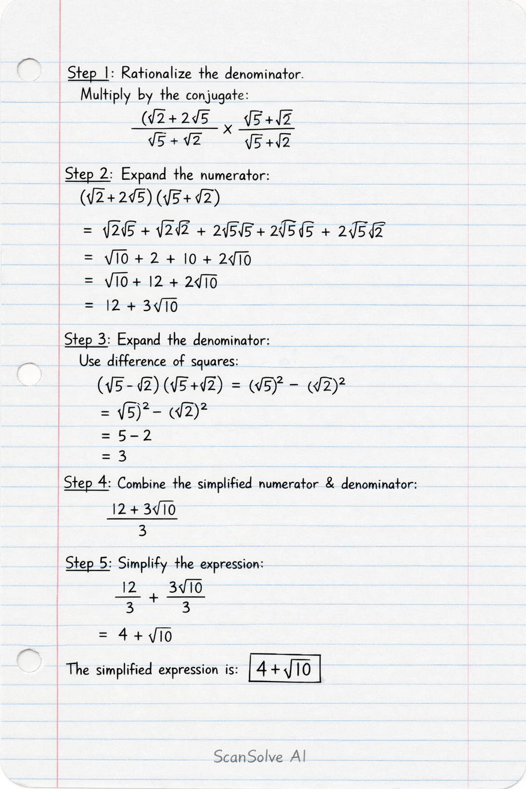 $$ \frac{\sqrt{2} + 2\sqrt{5}}{\sqrt{5} - \sqrt{2}} \times \frac{\sqrt{5} + \sqrt{2}}{\sqrt{5} + \sqrt{2}} $$