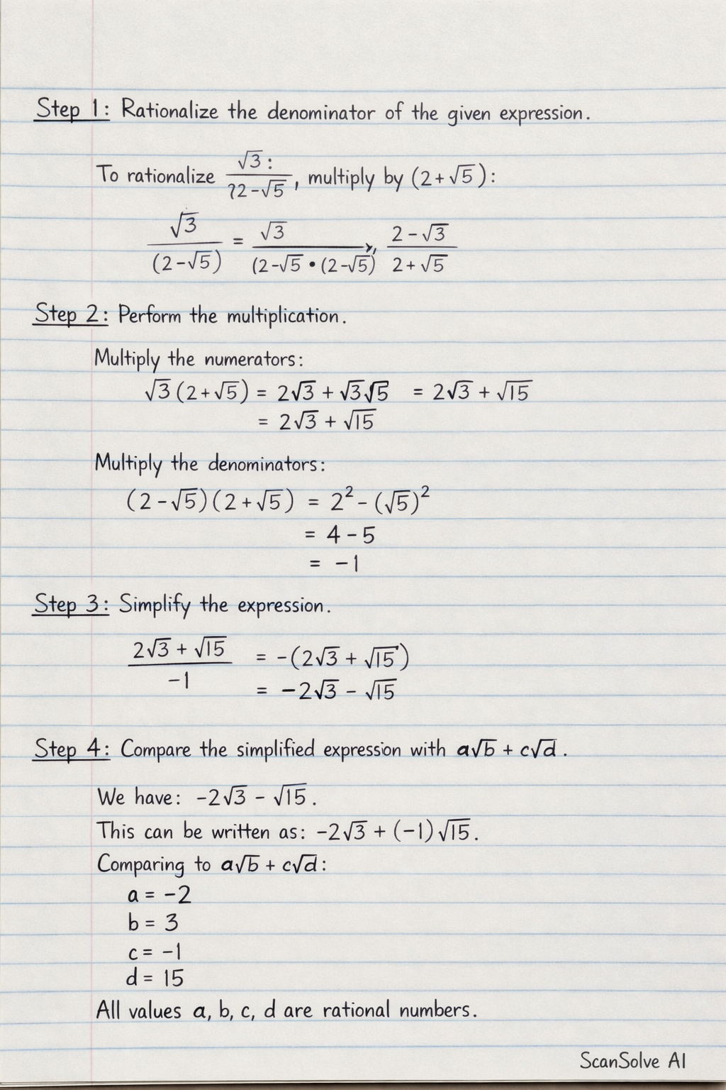 $$ \frac{\sqrt{3}}{2-\sqrt{5}} = \frac{\sqrt{3}}{2-\sqrt{5}} \times \frac{2+\sqrt{5}}{2+\sqrt{5}} $$