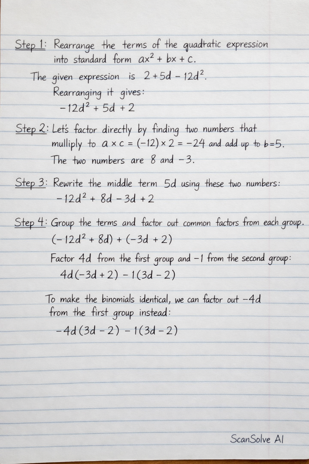 Step 2: Factor out −1 to make the leading coefficient positive, or factor directly. Let's factor directly by finding two numbers that multiply to a×c=(−12)×2=−24 and add up to b=5.