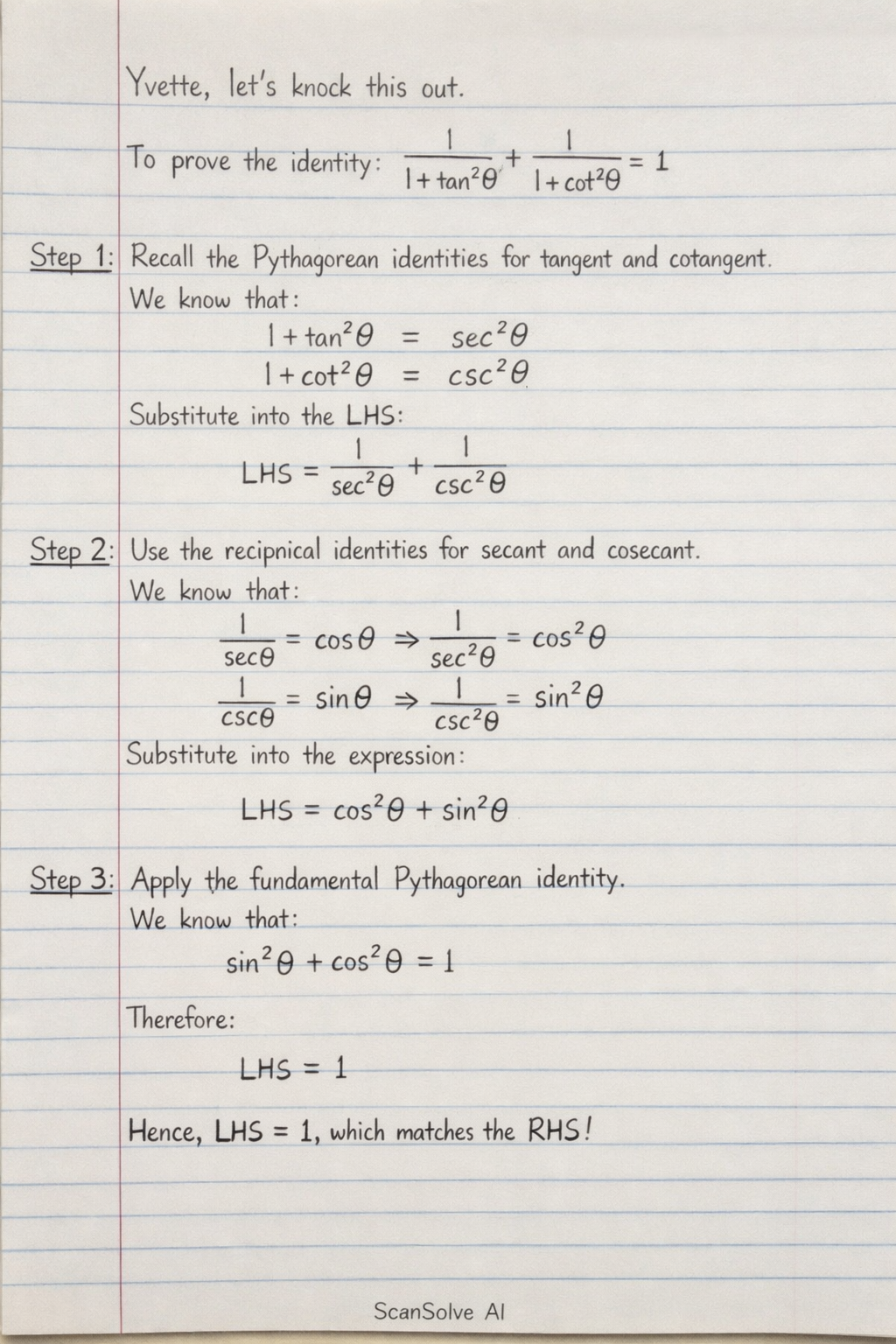 Step 1: Recall the Pythagorean identities for tangent and cotangent. We know that: Substitute these into the LHS of the equation: