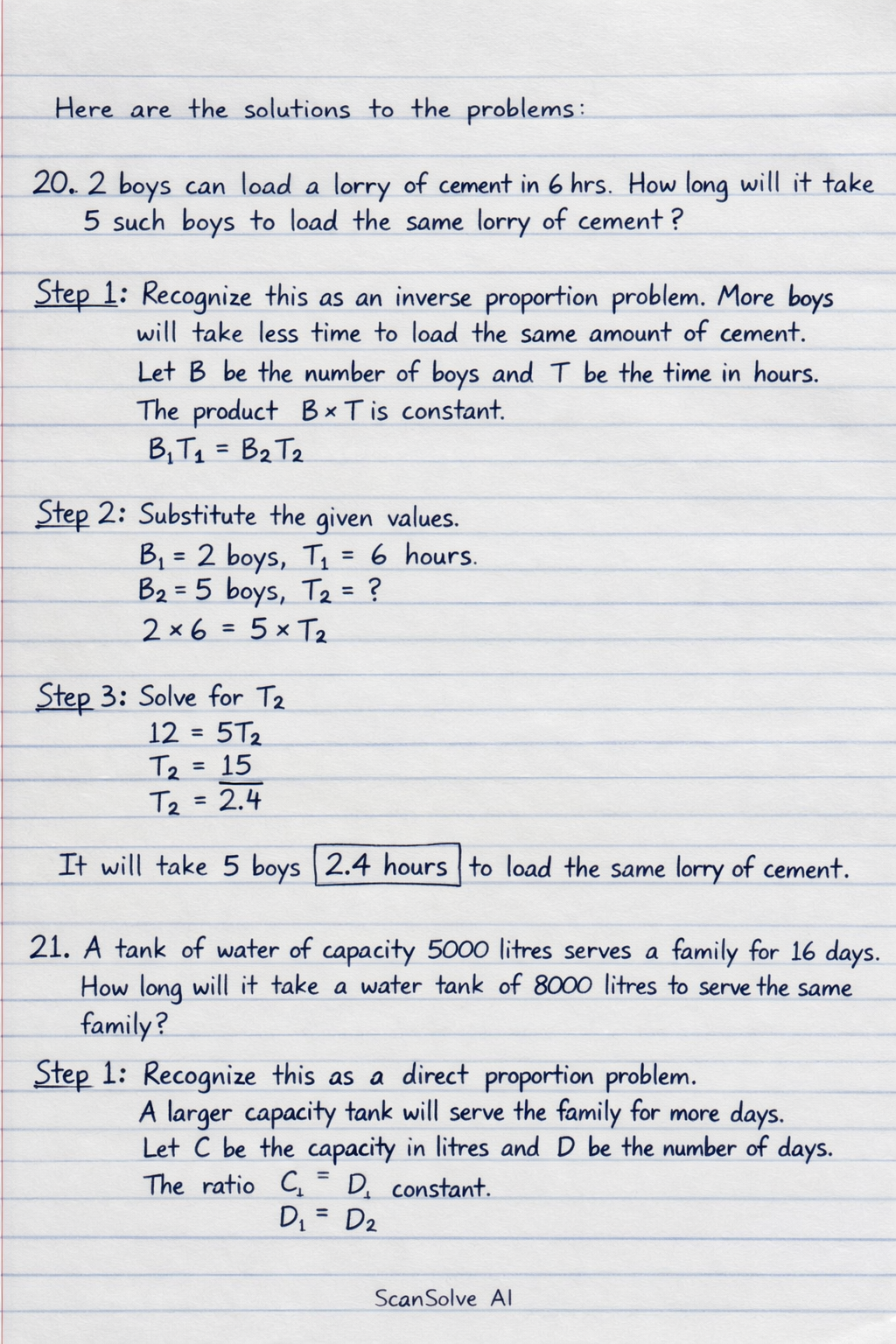 21. A tank of water of capacity 5000 litres serves a family for 16 days. How long will it take a water tank of 8000 litres to serve the same family?