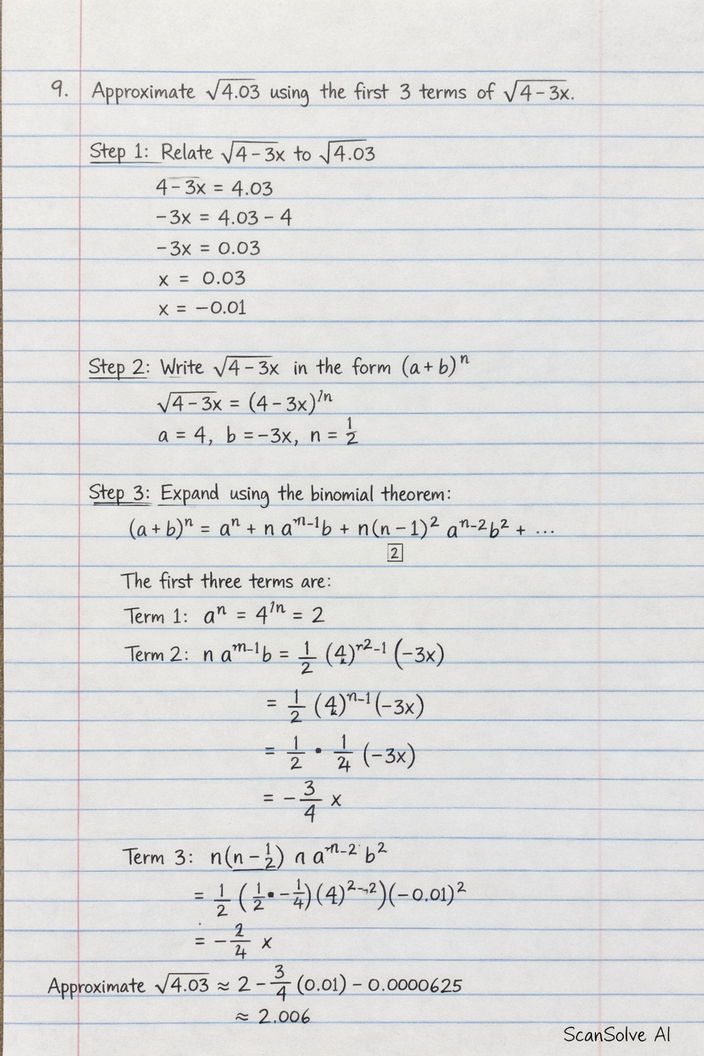 9. Use the first 3 terms in the expansion of $\sqrt{4-3x}$ to approximate $\sqrt{4.03}$ to 3 decimal places.