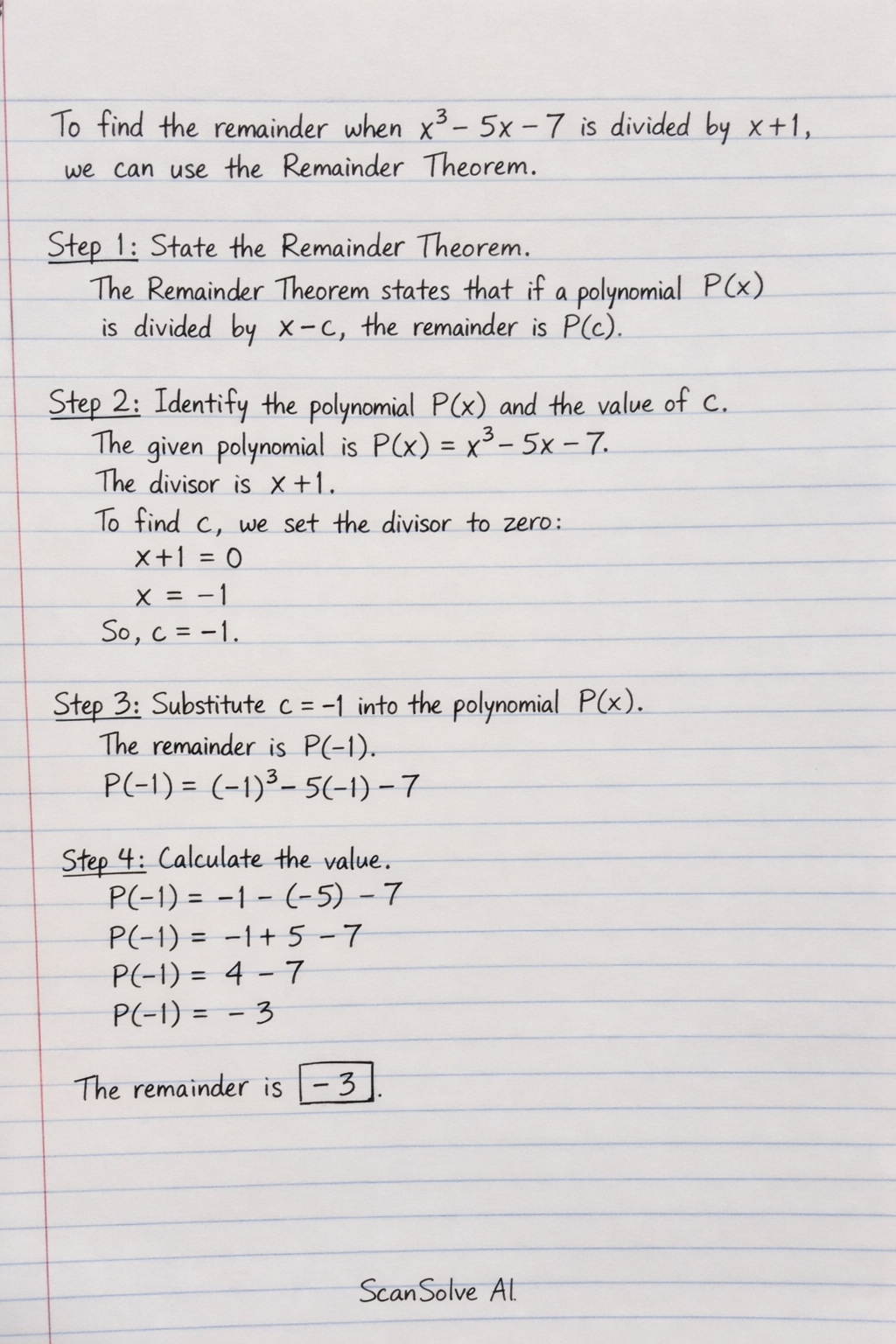 To find the remainder when x3−5x−7 is divided by x+1, we can use the Remainder Theorem.