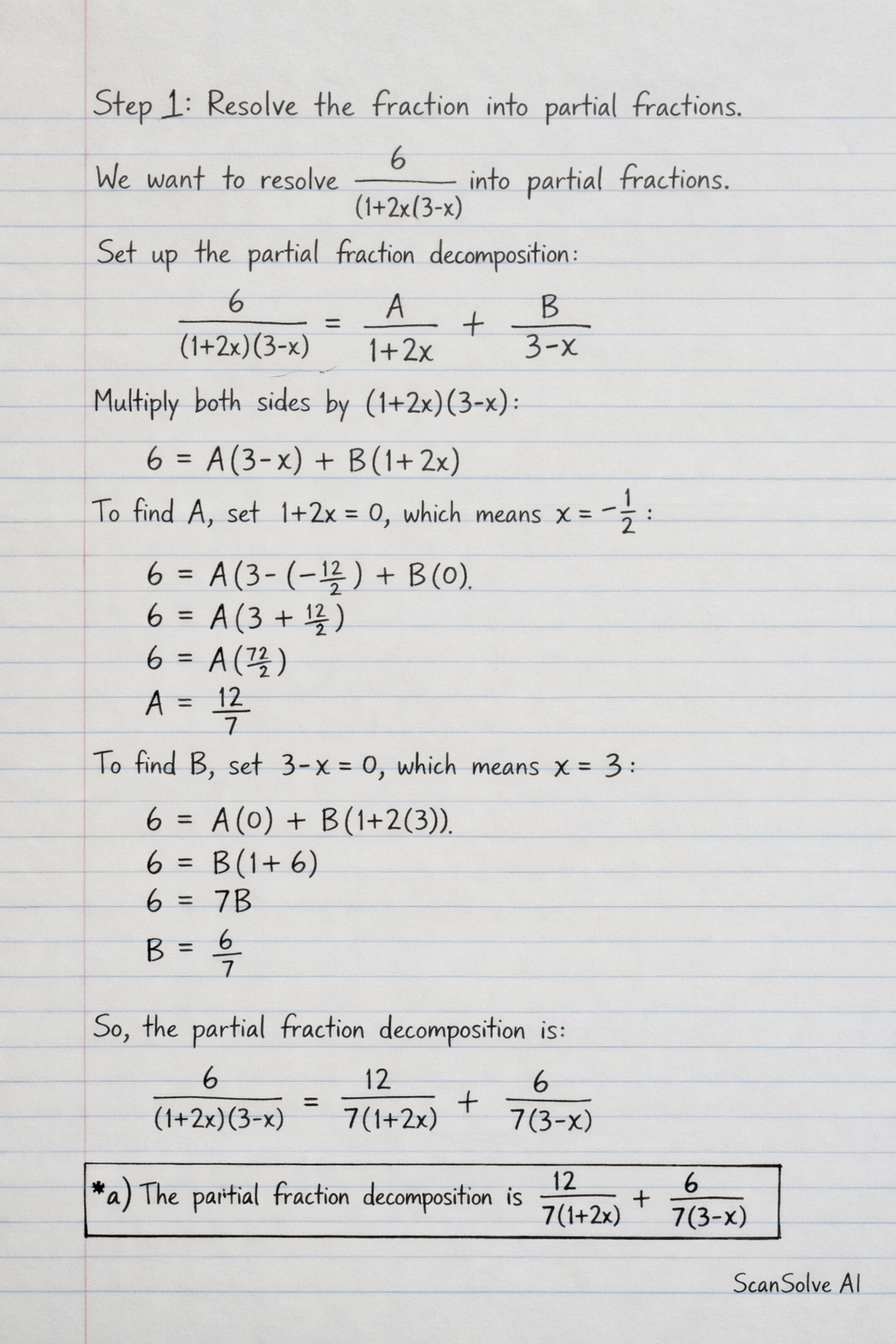 $$ \frac{6}{(1+2x)(3-x)} = \frac{12}{7(1+2x)} + \frac{6}{7(3-x)} $$