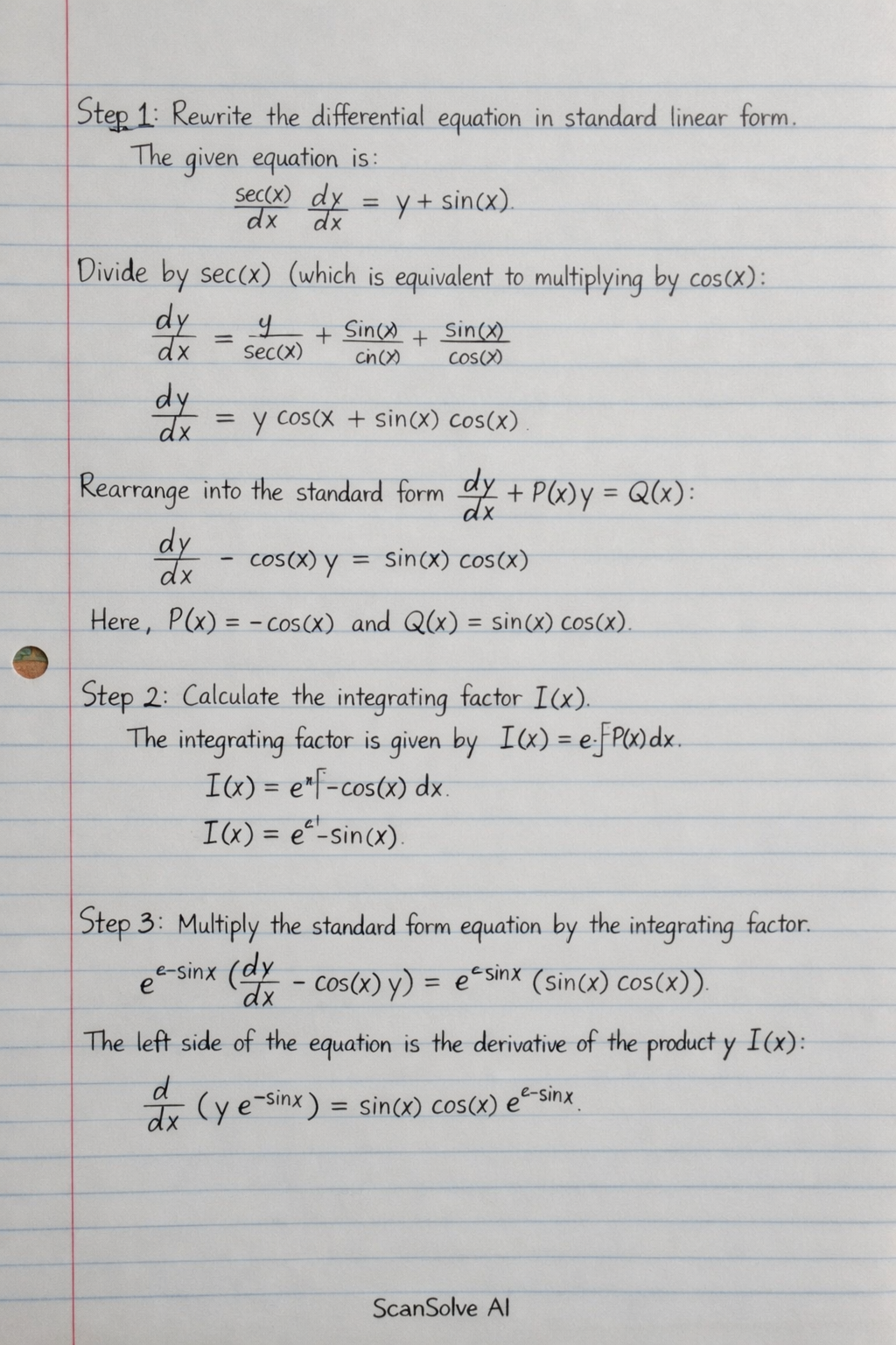 Here, P(x)=−cos(x) and Q(x)=sin(x)cos(x).