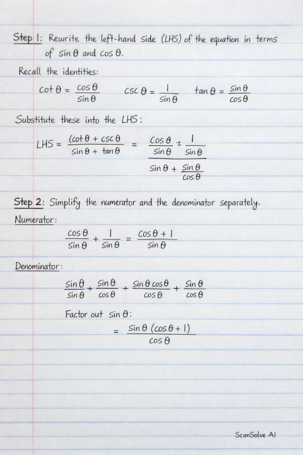 Step 1: Rewrite the left-hand side (LHS) of the equation in terms of sinθ and cosθ.